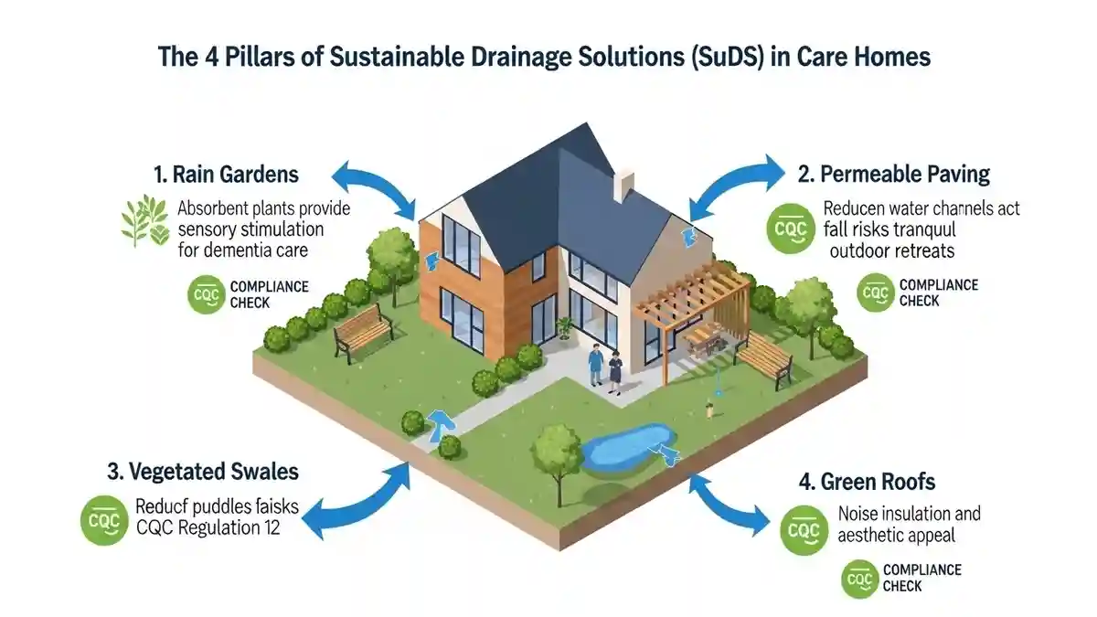 The future of sustainable drainage solutions CQC care home design is the integration of SuDS (Sustainable Drainage Systems). In Harrow, Policy EN18 of the Local Plan encourages SuDS to manage surface water runoff, which often plagues the surrounding area.